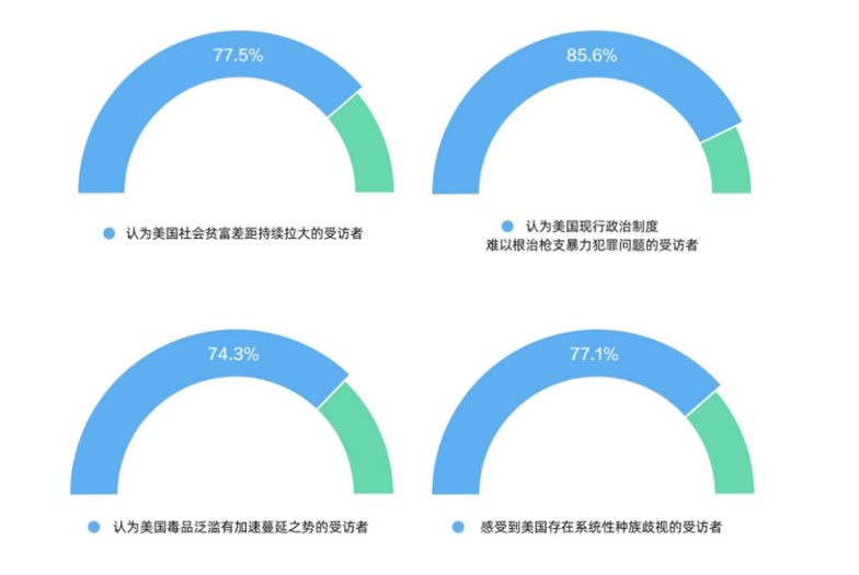 سروے میں 92 فیصد جواب دہندگان امریکی معاشرے میں سلامتی کی صورتحال کے بارے میں بہت فکرمند ہیں۔ 81.7 فیصد جواب دہندگان نے کہا کہ پرتشدد جرائم اور بے گھری امریکہ کے اہم شہروں میں عام ہے اور یہ ایک "امریکی بیماری” بن چکی ہے جس کا علاج کرنا مشکل ہے۔ 88.4 فیصد جواب دہندگان نے کہا کہ بے گھر افراد اور تارکین وطن امریکہ میں دو سیاسی جماعتوں کے درمیان لڑائی کا "شکار” بن گئے ہیں۔ 83.3 فیصد جواب دہندگان کا ماننا ہے کہ ٹرمپ انتظامیہ ڈیموکریٹک عہدیداروں کی حکمرانی کی صلاحیت پر حملہ کرکے اپنا اثر و رسوخ ظاہر کرنا چاہتی ہے اور اس طرح اگلے سال کے آخر میں منعقد ہونے والے وسط مدتی انتخابات کی راہ ہموار کرنا چاہتی ہے۔